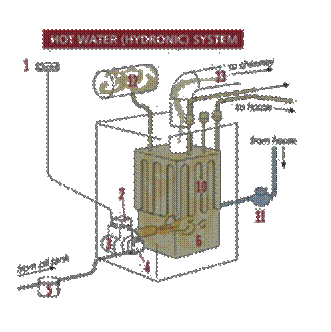 1. If you have a Hot Water (hydronic) System (upper diagram), water circulates around your boiler's heat exchanger (10). A circulator (11) pumps the hot water through radiators or baseboards. An expansion tank (12) adjusts to varying pressures.