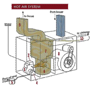 2. If you have a Warm Air System (lower diagram), air absorbs heat in your furnace's heat exchanger (7). A blower (8) sends this air through ducts (9) to heat your home.